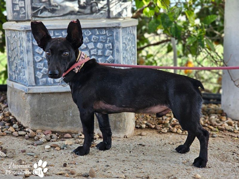 Gerade eben, am 11.12.2025, stand ein Pärchen mit diesem kleinen schwarzen Podenco vor unserem Tor. Beim Radfahren hatten sie beobachtet, wie er vor ein Auto lief.