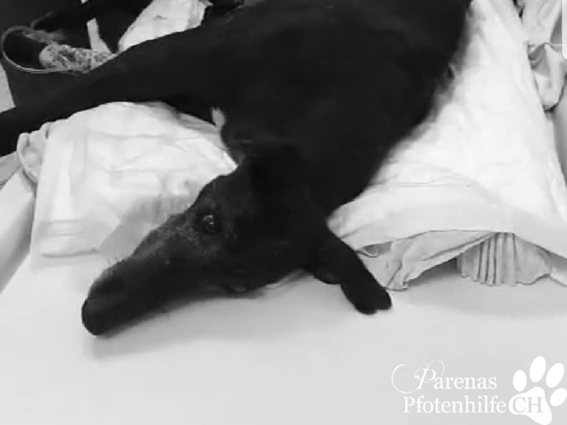 Ein befreundeter Tierschützer hat heute, Montagmorgen, 15.07.2019, eine stark verletzte schwarze Galga im Refugio abgegeben. Er hat sie gestern gefunden und hatte sie die Nacht über bei sich.. in der Nacht hat sich ihr Zustand rapide verschlechtert.