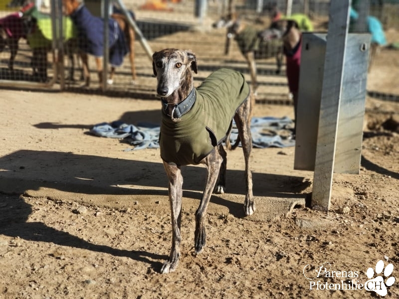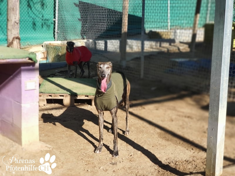 Im Freigehege hat Carmen sich einfach auf den Boden gelegt. Sie bedrängt Basil nicht, sie gibt ihm Freiraum. Er selbst darf entscheiden, ob er die Dame auf dem Boden kennenlernen möchte... Und tatsächlich kommt der mutige Galgo, beschnuppert Carmen und zeigt Interesse an ihr.❤️