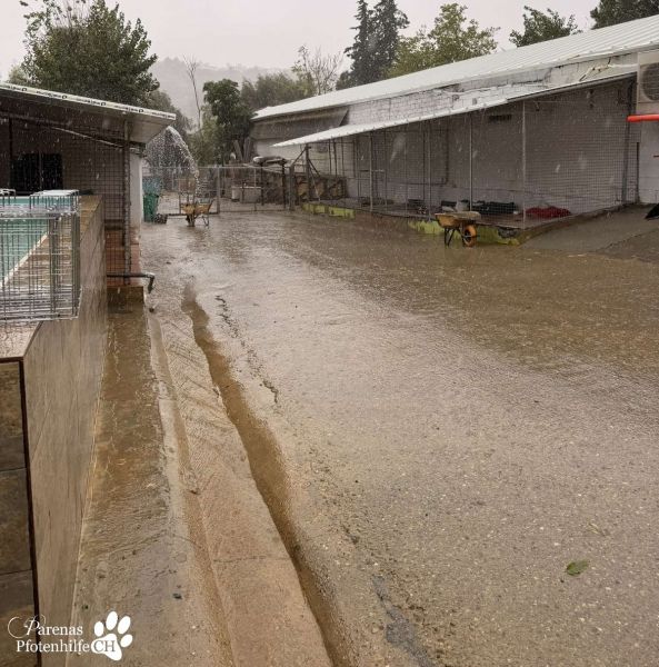 Leider gießt es heute, 16.11.2025, schon wieder aus Kübeln. Die Gehege stehen unter Wasser, und im Katzenhaus hat es in einem der Zimmer erneut einen Riss gegeben – das Wasser drückt unaufhaltsam hinein.