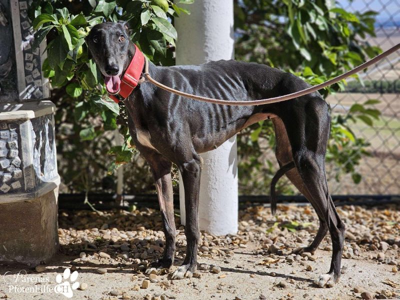 Mit ihrem zierlichen Körperbau, der weiß-grauen Schnauze und den sanft durchscheinenden Konturen ähnelt sie einem erfahrenen Windhund – dabei ist sie kaum über das Jugendalter hinaus.