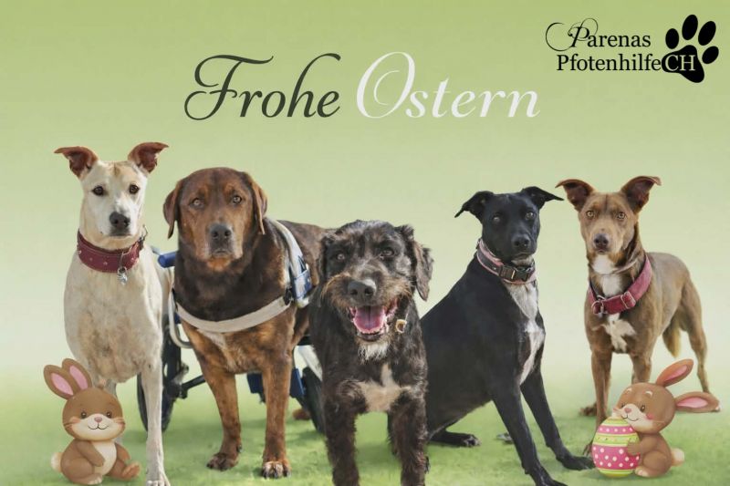 Unsere Engel Akila, Carlitos, Dado, Gloria und Kael, sowie alle anderen Schützlinge und das gesamte Parenas-Team – ob vor Ort in Spanien oder im Hintergrund mit ganz viel Herz im Einsatz – wünschen Euch von Herzen FROHE OSTERN und gemütliche, liebevolle Stunden mit Euren Liebsten.